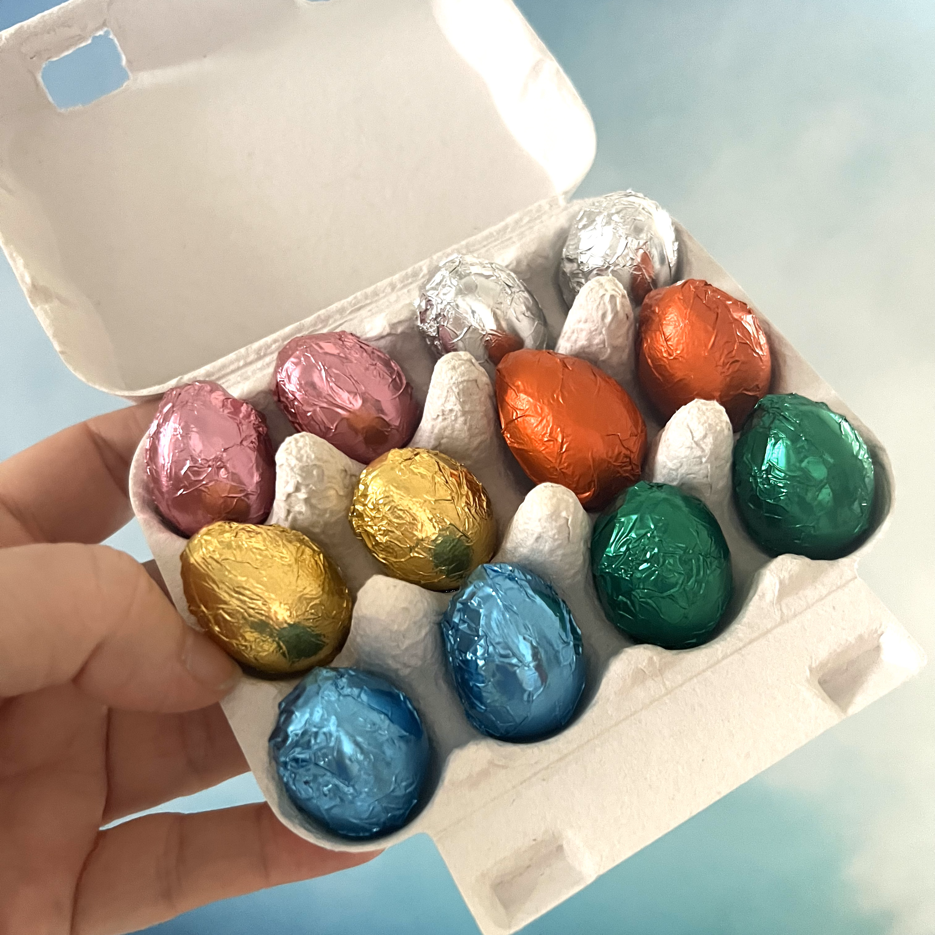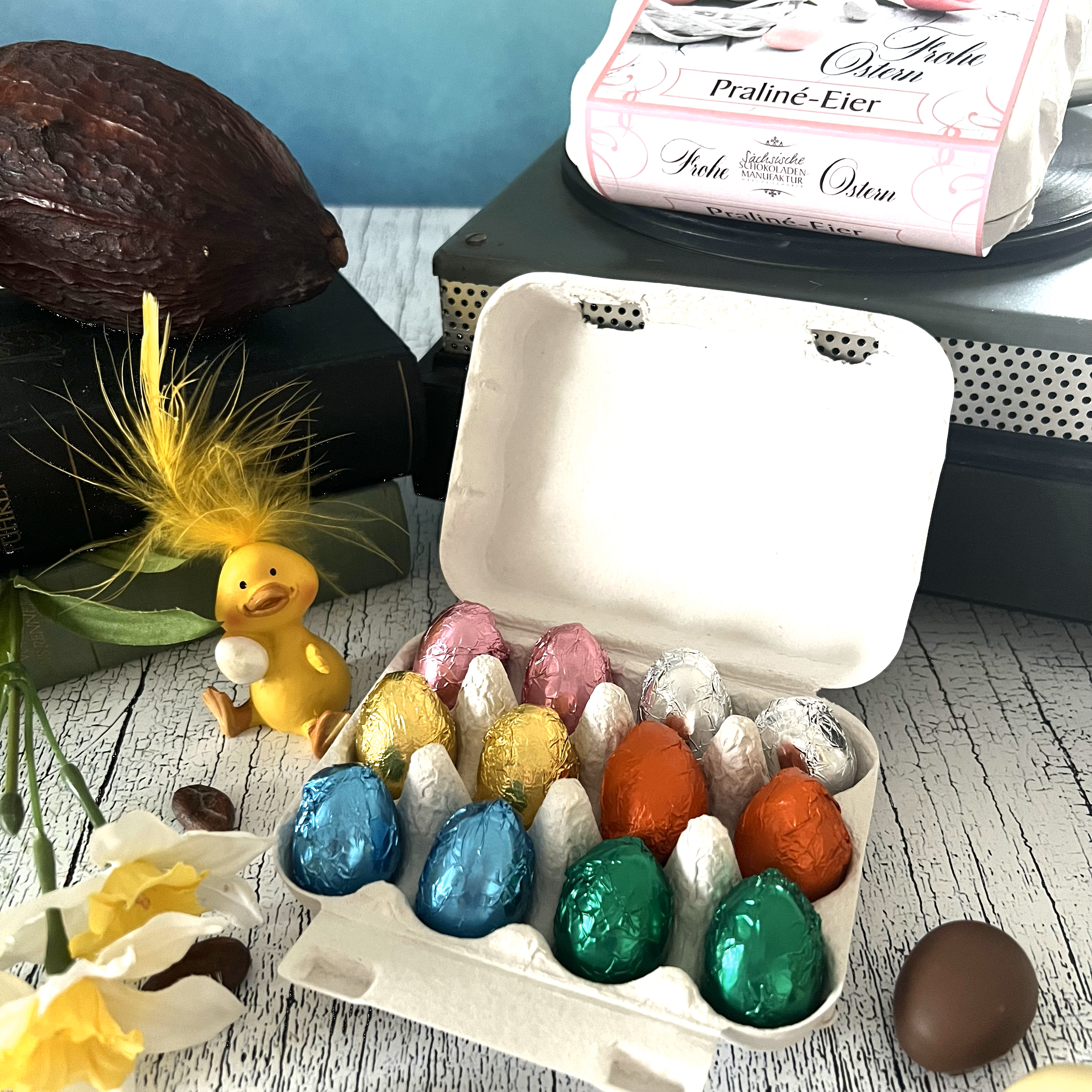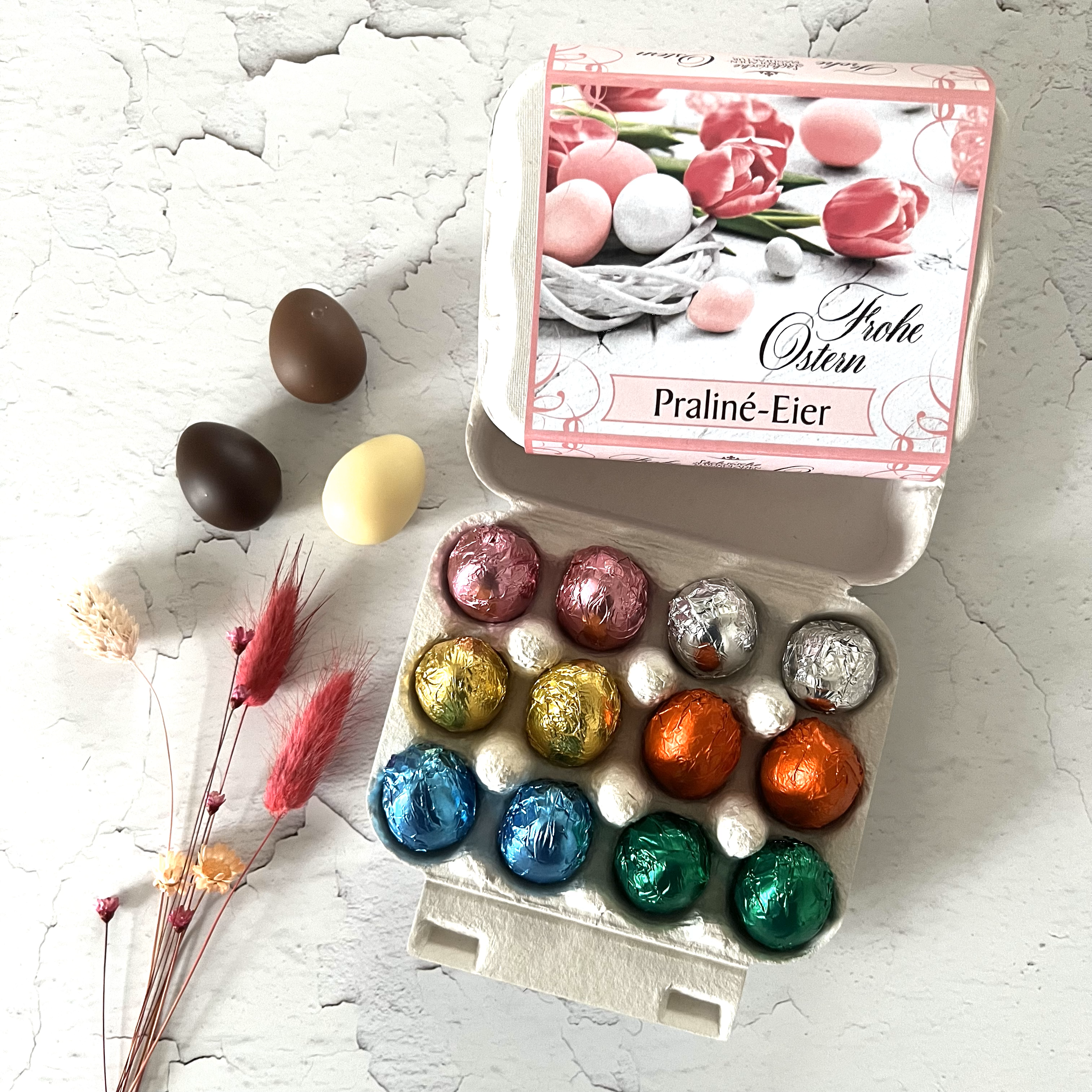 In dieser neckischen Verpackung haben wir 12 Praliné-Eier versteckt. Wer unsere Pralinen mag, kommt an dieser Sortierung einfach nicht vorbei!